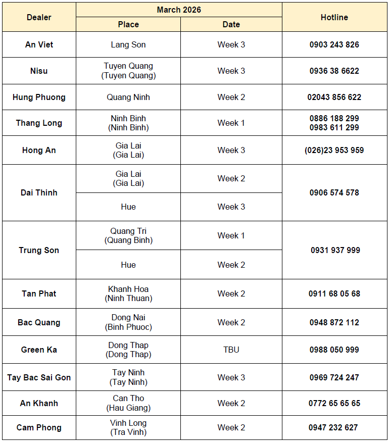 To thank Customers for trusting and using our products, with the desire to accompany and take care of the vehicles to operate in perfect condition, ISUZU Vietnam would like to inform Customers of the schedule of Mobile Service events in March 2026.