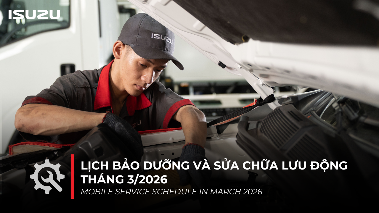 Nhằm tri ân khách hàng đã tin dùng sản phẩm cùng với mong muốn được đồng hành và chăm sóc cho xe được vận hành trong điều kiện hoàn hảo nhất. ISUZU Việt Nam xin gửi đến Quý Khách hàng lịch trình tổ chức chương trình “Bảo dưỡng & Sửa chữa lưu động” trong tháng 3 năm 2026.