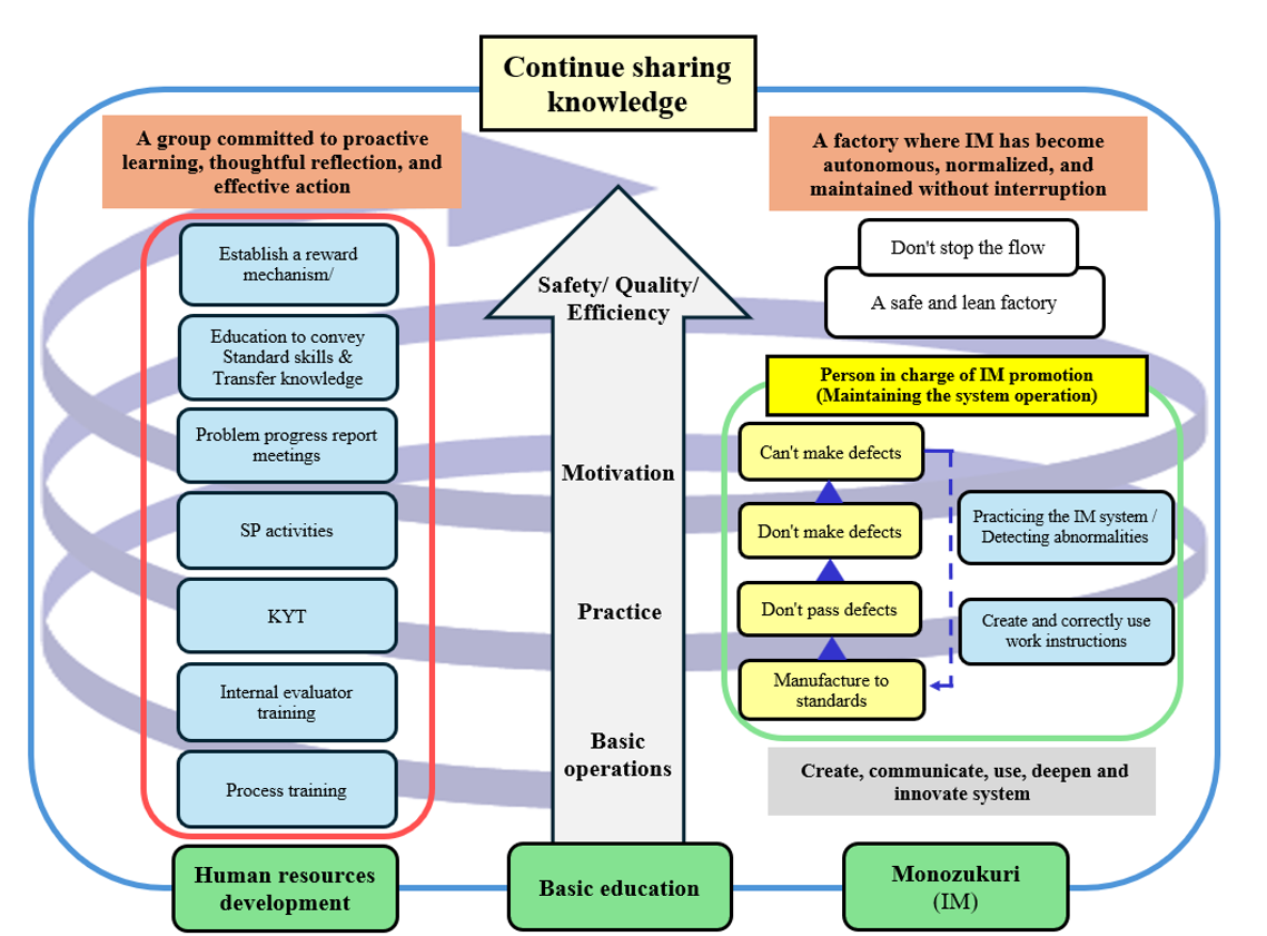 In addition, based on the principle that “People are still likely to make mistakes no matter how hard they strive,” IM established its quality management system on a “spiral-up” model with three steps: “do not pass defects” “do not make defects,” and “cannot make defects,” all grounded in the fundamental step of “standardized production.” This ensures defective products are prevented from reaching the market or customers, aiming at the ultimate goal of 100% quality assurance.
